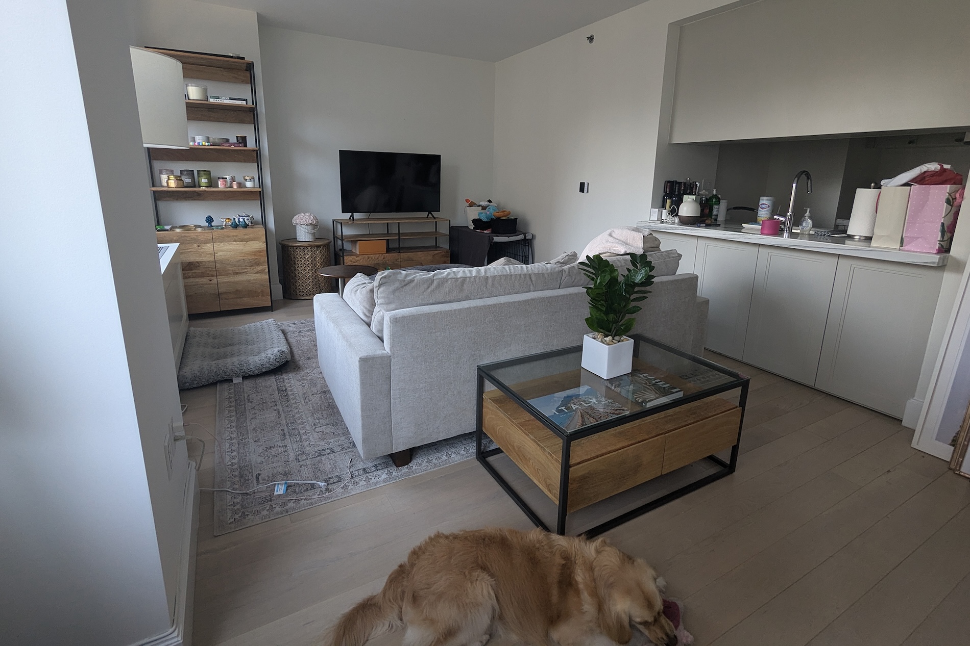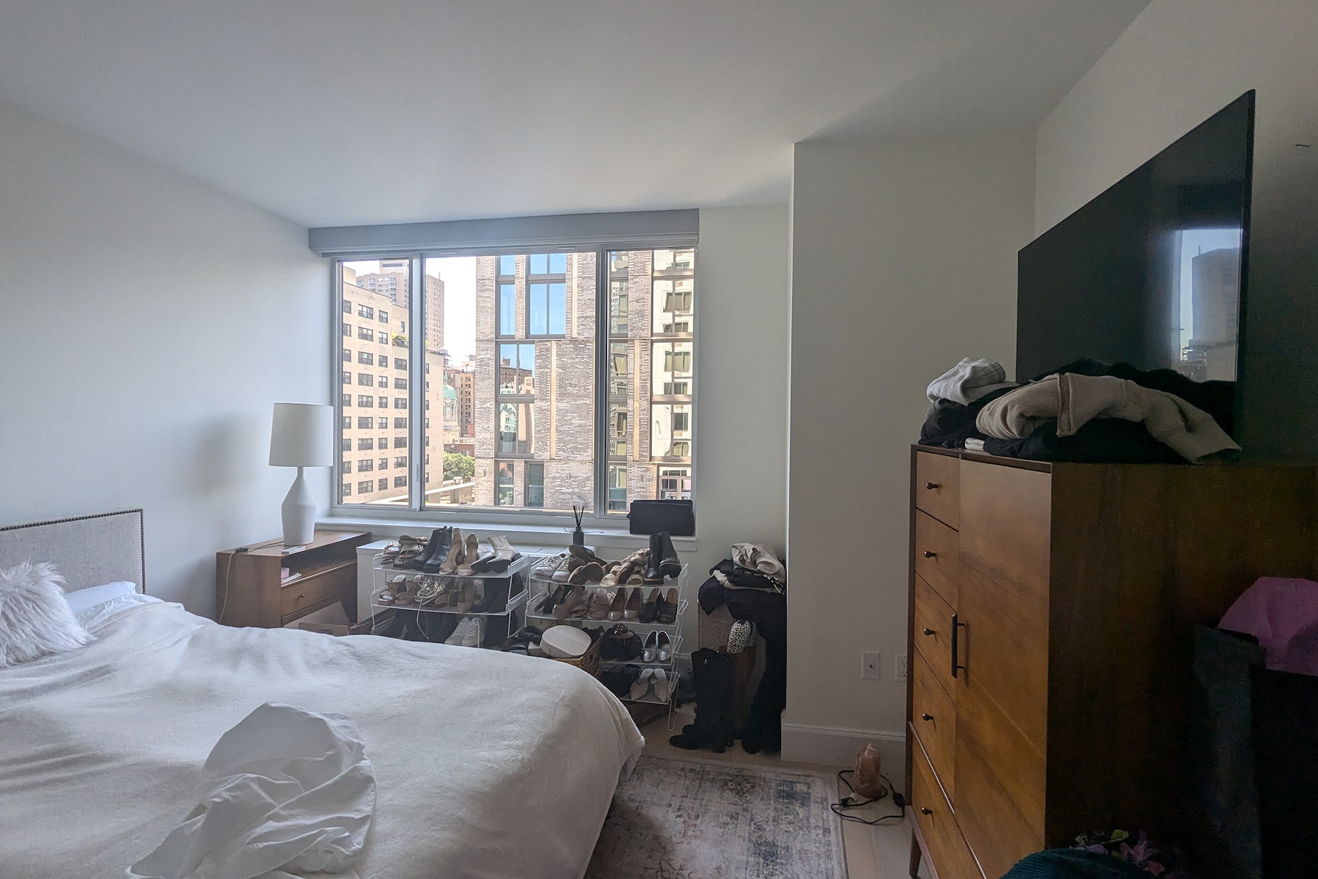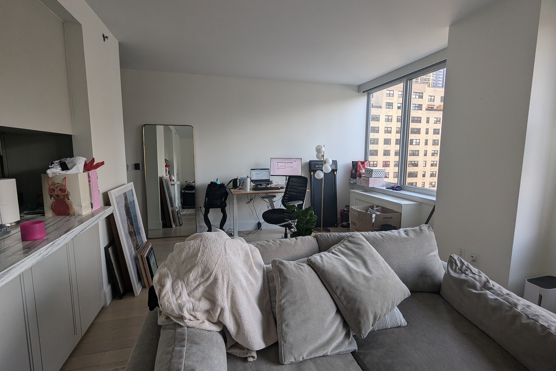 The key moves here are: adding architectural molding to add depth to the walls, tiling the cabinet surfaces in the living room to create a focal point, installing full length drapery to frame the spectacular views, hanging chandeliers to add needed lighting while accentuating the gracious ceilings, creating bespoke storage solutions for both the bedroom and home office, and incorporating interesting details, from tassel fringes to drawer pulls, to make every piece feel special.