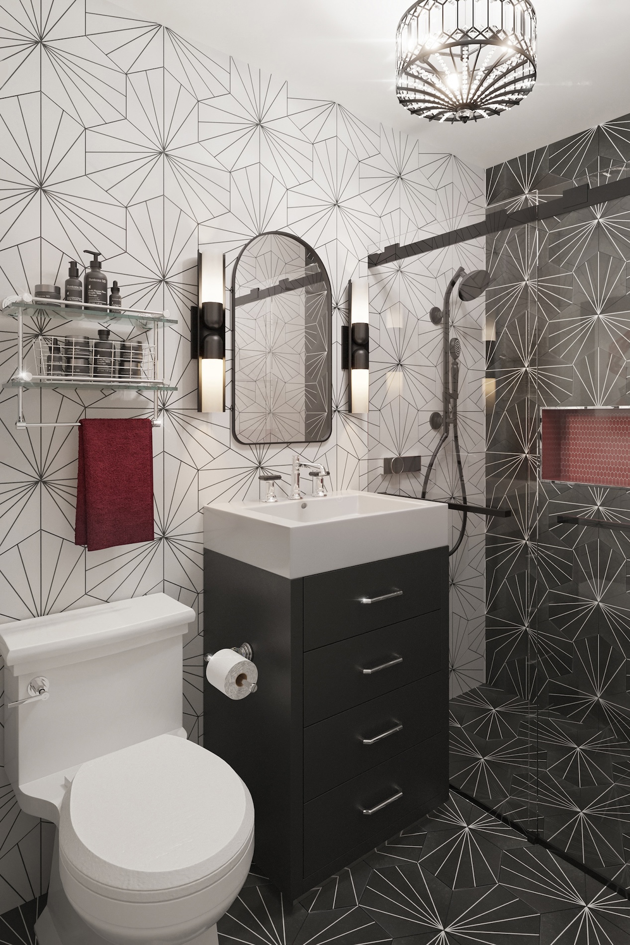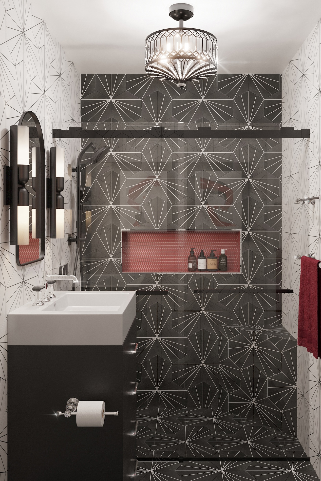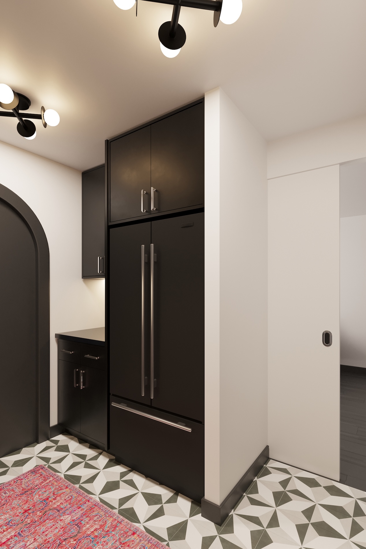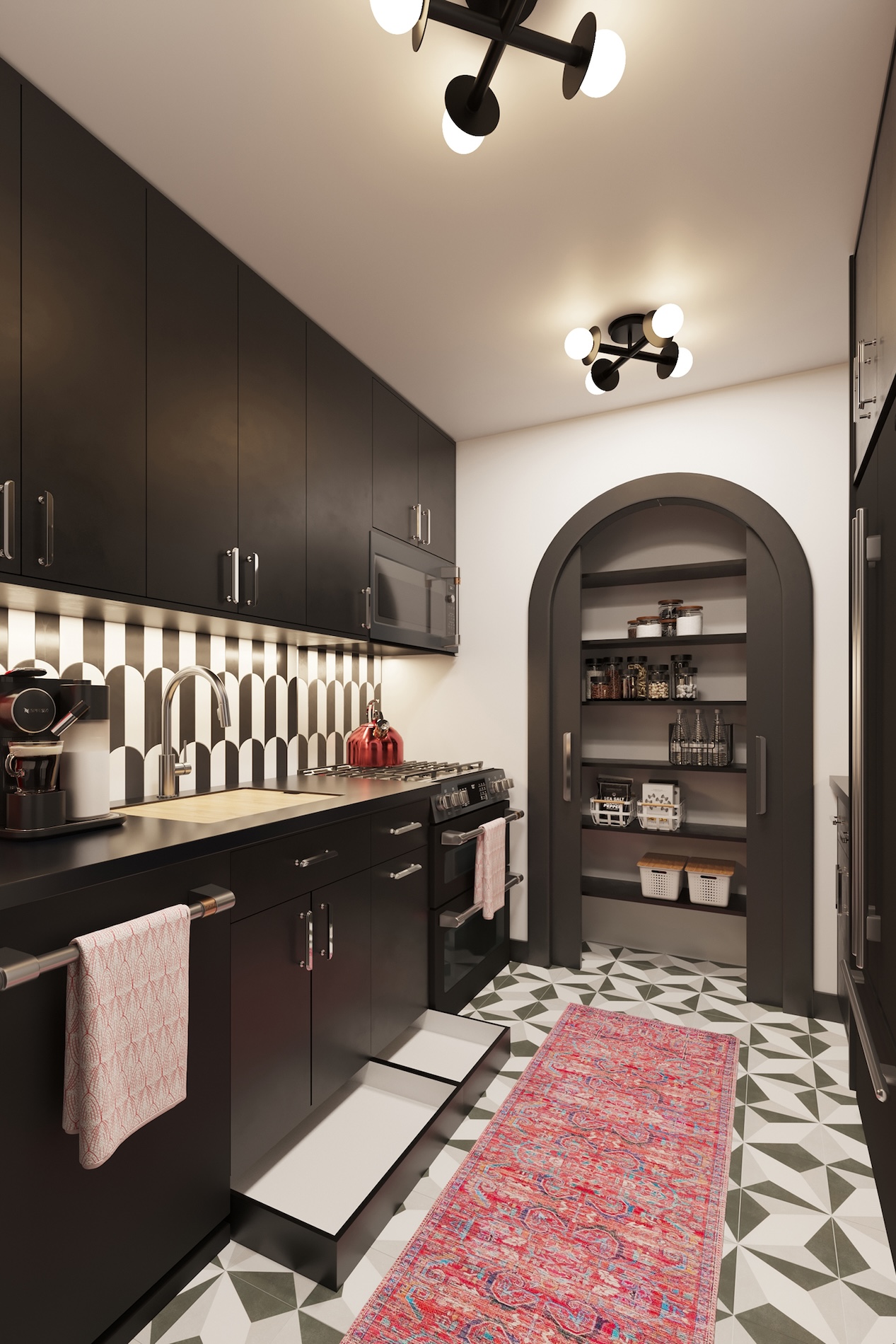 The key moves here are: changing the approach to the kitchen to create a walk-in entry closet, flipping the orientation of the electrical panel to create the entry niche, adding the double arched pantries in the kitchen, and rotating the linen closet, while keeping every space to a tight palette of graphic black and white with ruby accents and art deco details.