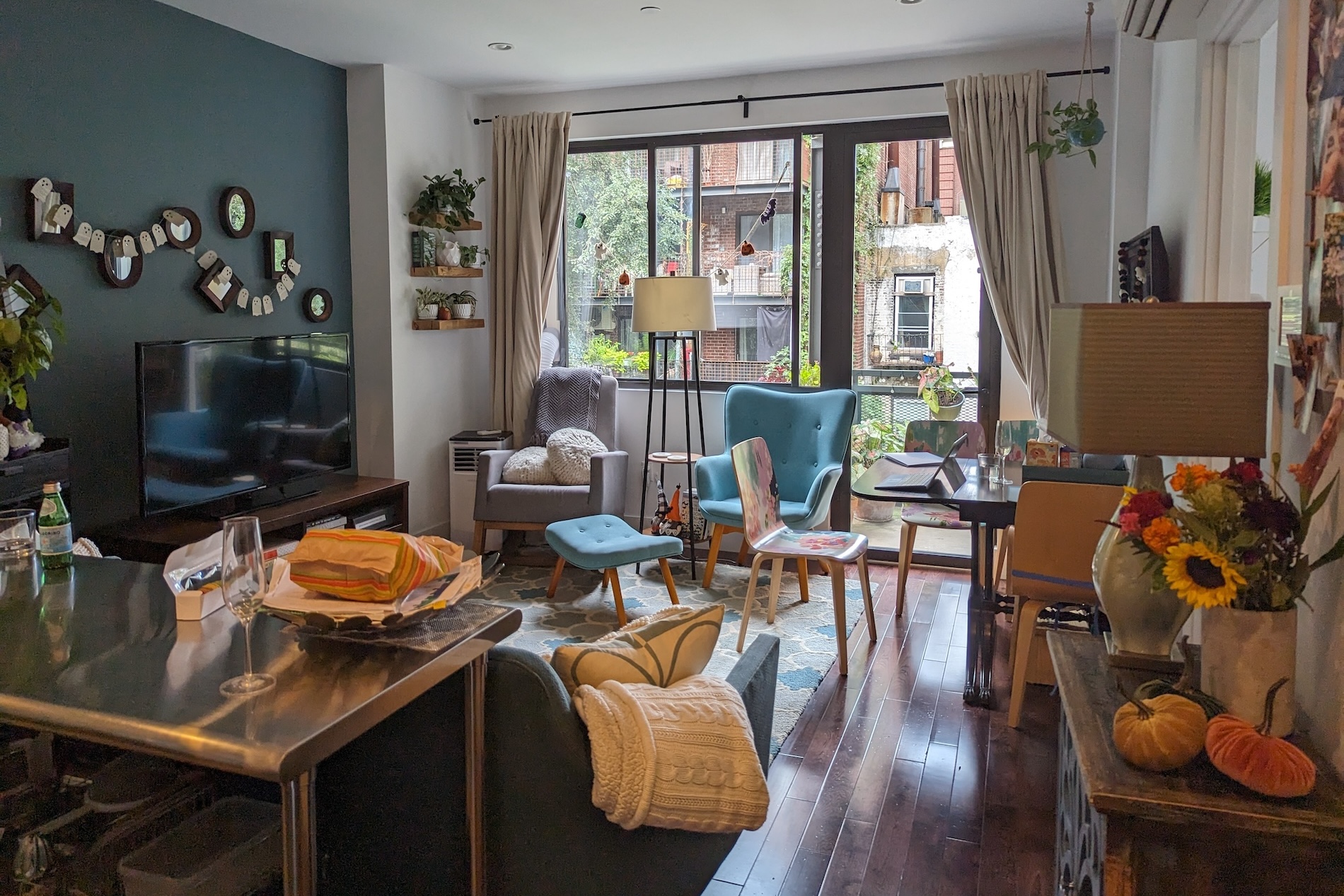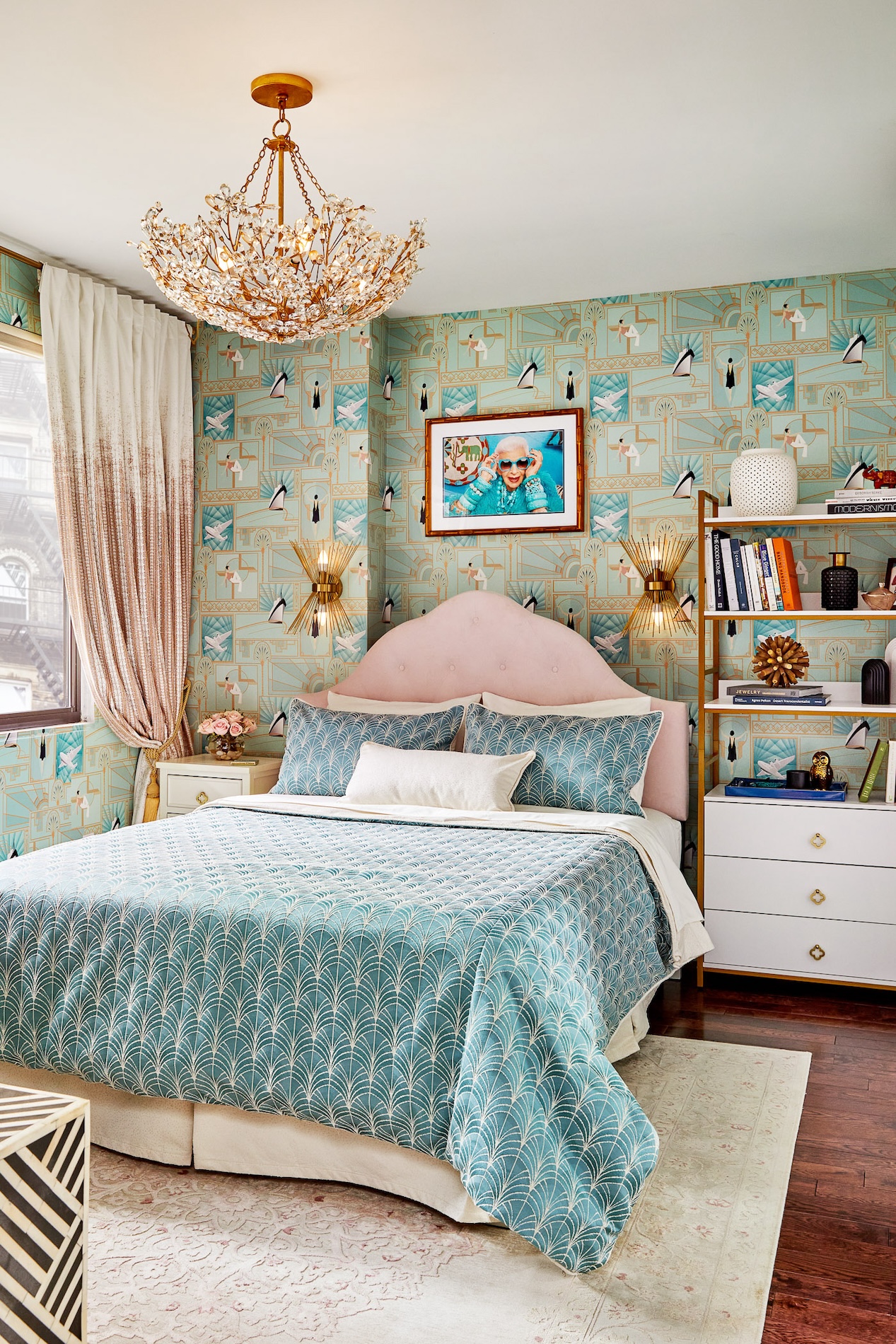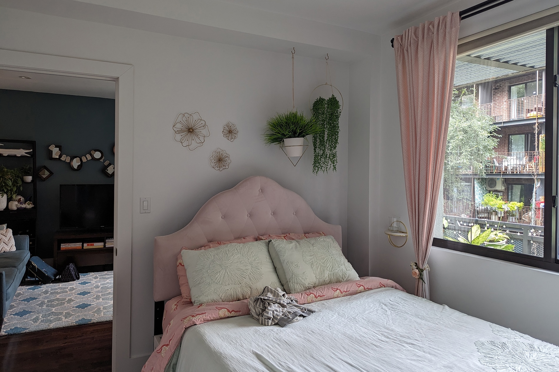 The key moves here are: removing the dining table and chairs, replacing the stainless steel counter with an island complemented by dining stools, moving the television opposite the sofa where the dining table had been, and flipping the layout of the bedroom. Customized wallpapers and fabrics create a whimsical vibe the client wanted while wall shelves provide plenty of child-safe space for her urban garden.